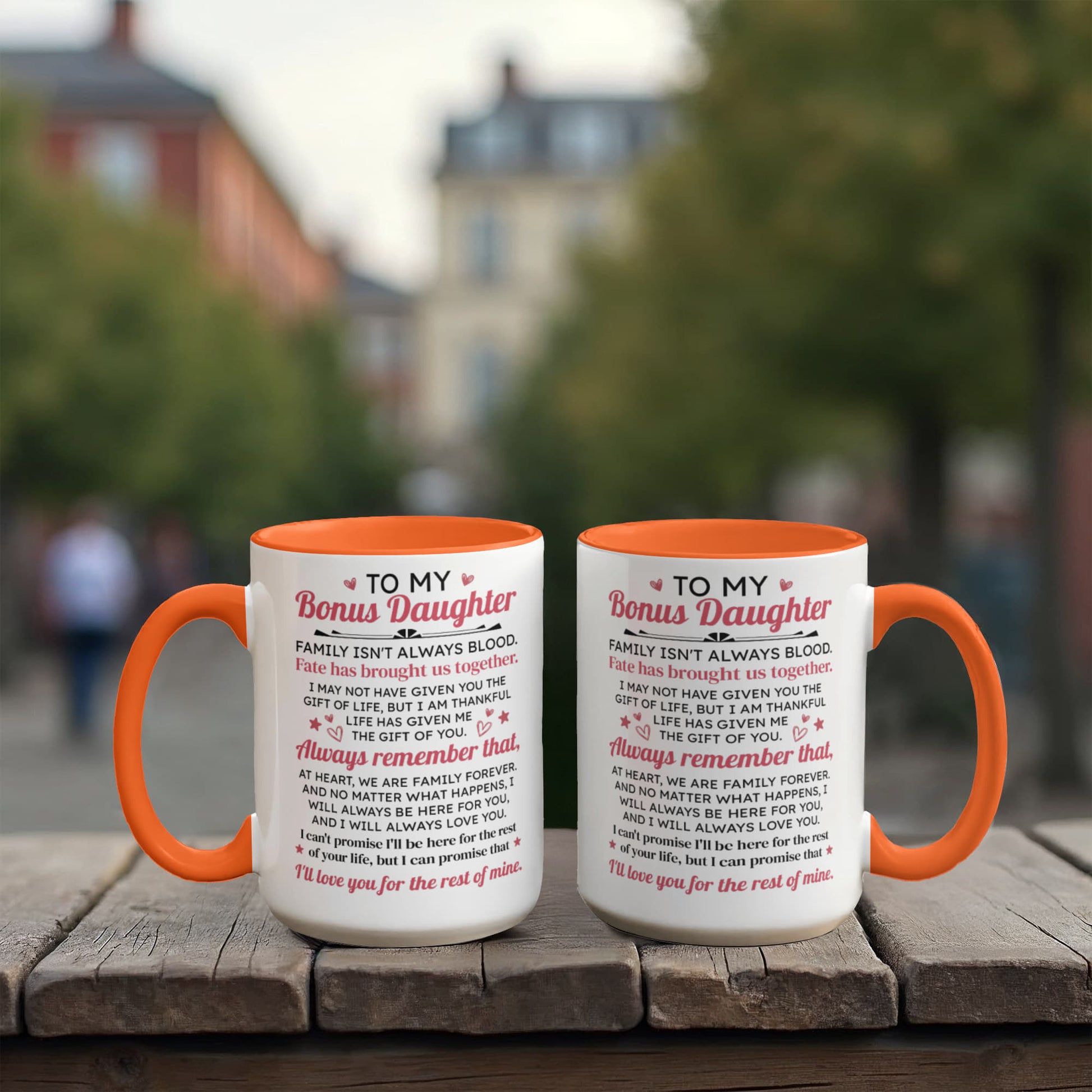 - High quality ceramic mug with two-tone rim, interior, & handle